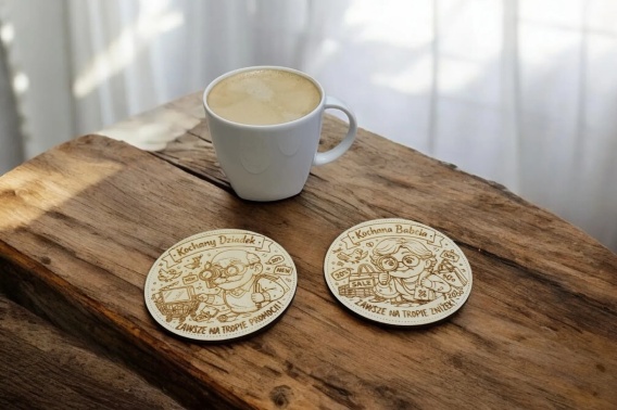 drewniane podstawki pod kubek z grawerem to połączenie humoru, ciepłych emocji i naturalnego stylu.