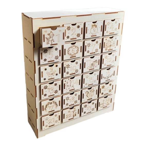 Drewniany Kalendarz Adwentowy z Szufladkami 24 – Boże Narodzenie Oczekiwanie na Święta Bożego Narodzenia jeszcze nigdy nie było tak magiczne! Ten drewniany kalendarz adwentowy z 24 szufladkami to idealny sposób, by codziennie odkrywać małe niespodzianki, tworząc wyjątkowy świąteczny nastrój w domu. Opis produktu: Materiał: wysokiej jakości sklejka drewniana Wymiary całkowite: 31 cm wysokości x 25 cm szerokości Wymiary wewnętrzne szufladki: 6,6 cm x 4 cm Liczba szufladek: 24 – po jednej na każdy dzień grudnia aż do Wigilii Każda szufladka ozdobiona świątecznym grawerem (renifer, choinka, Mikołaj, wieniec, prezenty i inne) Starannie wycięty laserowo – perfekcyjna dokładność detali Produkt wielokrotnego użytku – może służyć przez wiele lat Idealny do wypełnienia: słodyczami i drobnymi upominkami, karteczkami z zadaniami adwentowymi, biżuterią, mini kosmetykami, figurkami itp. Zalety: Ekologiczny i trwały materiał Możliwość własnej personalizacji (malowanie, ozdabianie, decoupage) Piękna dekoracja świąteczna do domu, przedszkola lub biura Idealny prezent dla dzieci i dorosłych Słowa kluczowe (SEO): drewniany kalendarz adwentowy, kalendarz adwentowy z szufladkami, kalendarz adwentowy DIY, ozdoba świąteczna drewniana, kalendarz bożonarodzeniowy, prezent na święta, kalendarz adwentowy dla dzieci, świąteczny organizer z szufladkami Stwórz własny, niepowtarzalny kalendarz adwentowy i ciesz się magią Świąt każdego dnia!