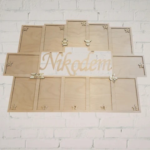 Personalizowana ramka z metryczką na 12 zdjęć to wyjątkowa pamiątka narodzin dziecka. Wykonana z naturalnego drewna, posiada miejsce na 12 fotografii oraz centralnie umieszczone imię i dane z dnia urodzenia (data, godzina, waga, wzrost). Idealna jako prezent na narodziny, chrzest lub roczek. Stylowa dekoracja do pokoju dziecięcego i piękna forma zachowania wspomnień z pierwszego roku życia.