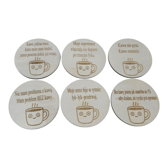 Zestaw drewnianych podstawek pod kubek – cytaty o kawie